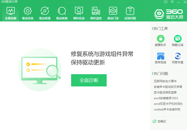 1、我们打开360驱动大师,点击诊断,看看是不是网卡驱动没有安装。如果是点击修复即可。