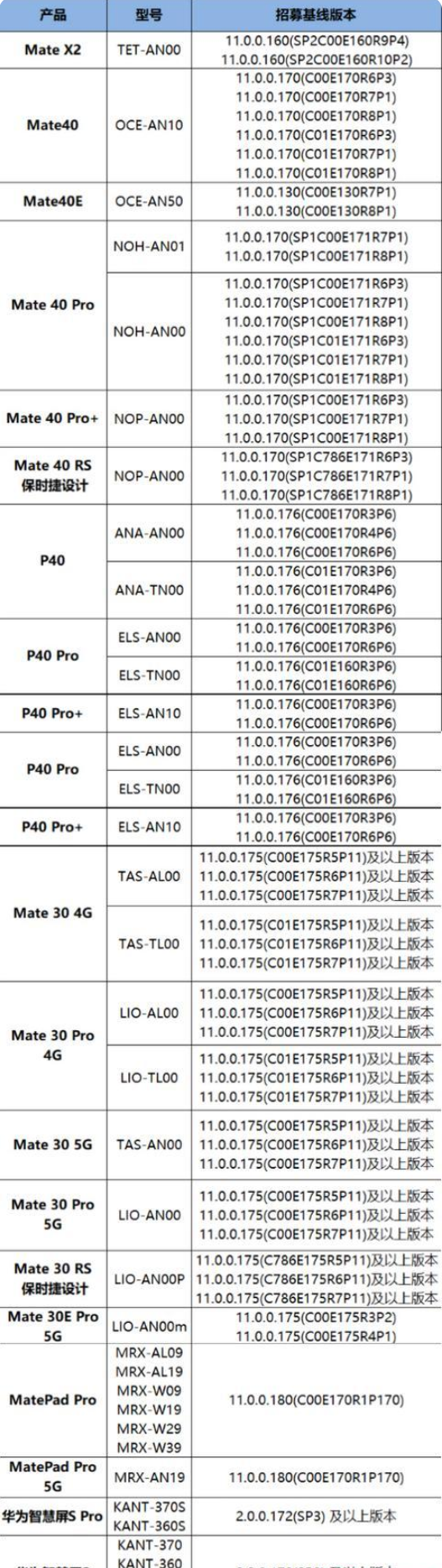 当前支持OTA升级的系统版本清单为Mate X2、Mate40、Mate40E、Mate 40 Pro、Mate 40 Pro+、Mate 40 RS 保时捷设计、P40、P40 Pro、P40 Pro+、Mate 30 4G、Mate 30 Pro 4G、Mate 30 5G、Mate 30 Pro 5G、Mate 30 RS保时捷设计、Mate 30E Pro 5G、MatePad Pro、MatePad Pro 5G、华为智慧屏S、华为智慧屏S Pro,更多机型请关注官方信息更新。