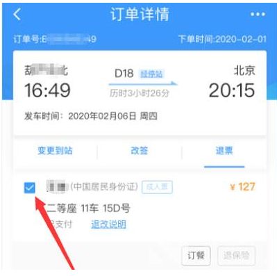 9、进入订单详情页面后,选择“退票”按钮,选择需要退票的乘车人,点击“立即退票”;