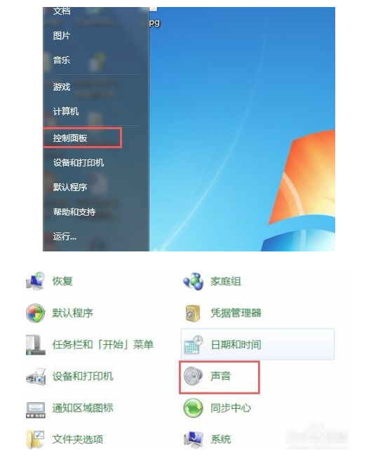 1、点击【开始】->【控制面板】->【声音】->【扬声器】;