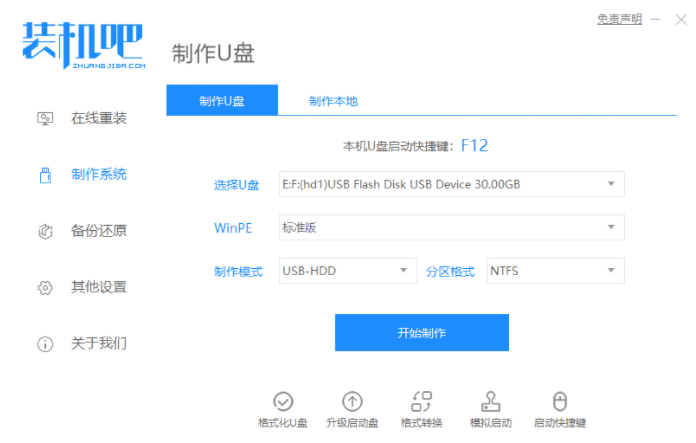 1、下载装机吧一键重装系统软件。插上U盘,打开软件,在软件中选择制作系统,选择制作,一般默认即可。