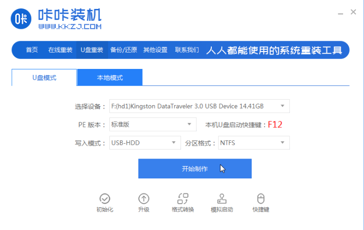 1、先在一台可用的电脑上下载安装咔咔装机一键重装系统工具并打开,插入一个8g以上的空白u盘,选择u盘重装系统模式,点击开始制作。