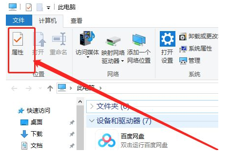 1、将U盘插入电脑,然后打开此电脑,选择左上角“属性”。