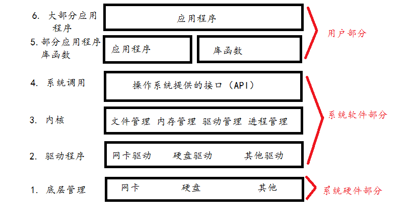 (1)内核,主要用于进程管理,文件管理,内存管理,驱动管理