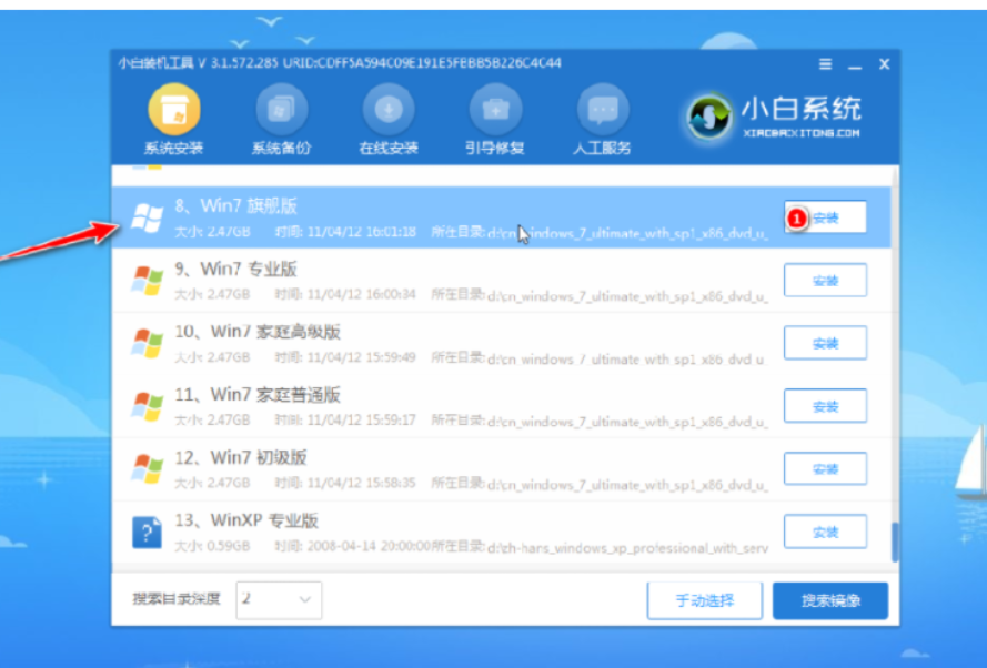 6、pe内,打开小白装机工具选择需要安装的系统执行安装,目标分区选择“C盘”。