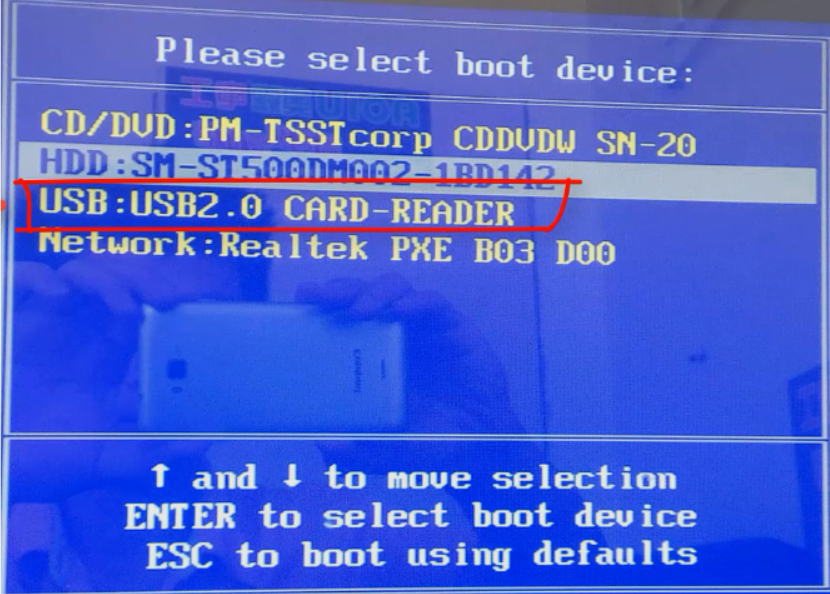 4、将U盘插入需要重装的电脑,并重启电脑快速断续的按启动热键进入快速启动界面,选择带USB开头的u盘启动项回车键进入。