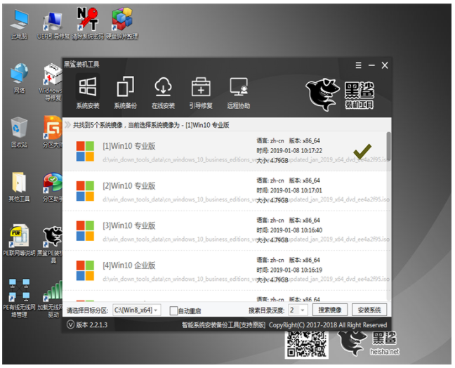 8、进入到PE系统桌面后会自动弹出黑鲨PE装机工具,这里勾选需要安装的Win10系统,目标分区选择你的系统盘(一般为C盘),之后点击“安装系统”即可。