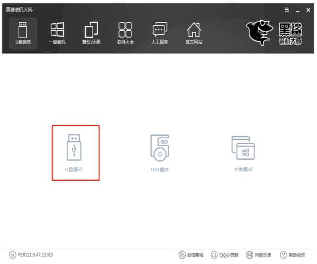 1、u盘怎么装win10呢?首先准备一个8G左右的U盘,下载黑鲨装机大师软件,重装前关闭防火墙与杀毒软件,备份好C盘的重要文件资料,然后把U盘插到电脑USB接口,运行黑鲨装机大师软件,点击U盘模式。