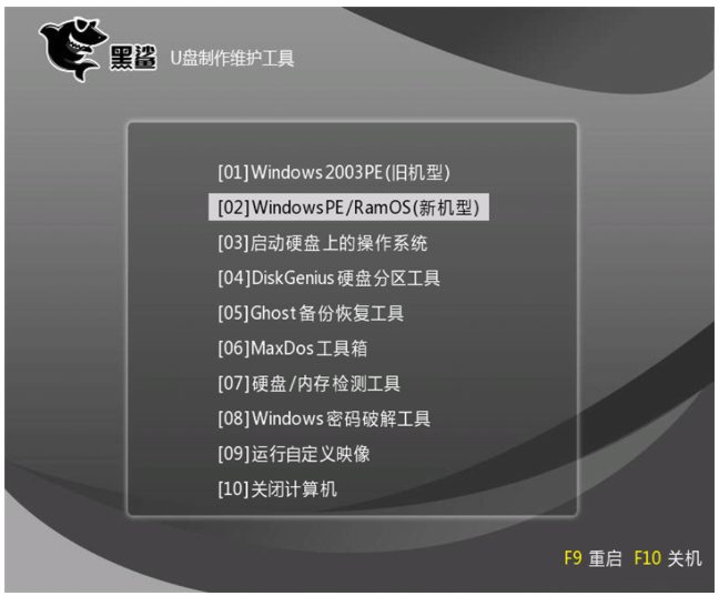 7、下面来到黑鲨PE启动菜单选择界面,一般选择【2】WindowsPE/RamPS(新机型),然后回车即可进入黑鲨PE。