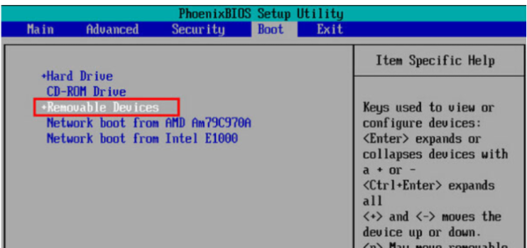 2.先将光标移动到boot选项卡,打开后再用上下键移动removeble device可移动设备。