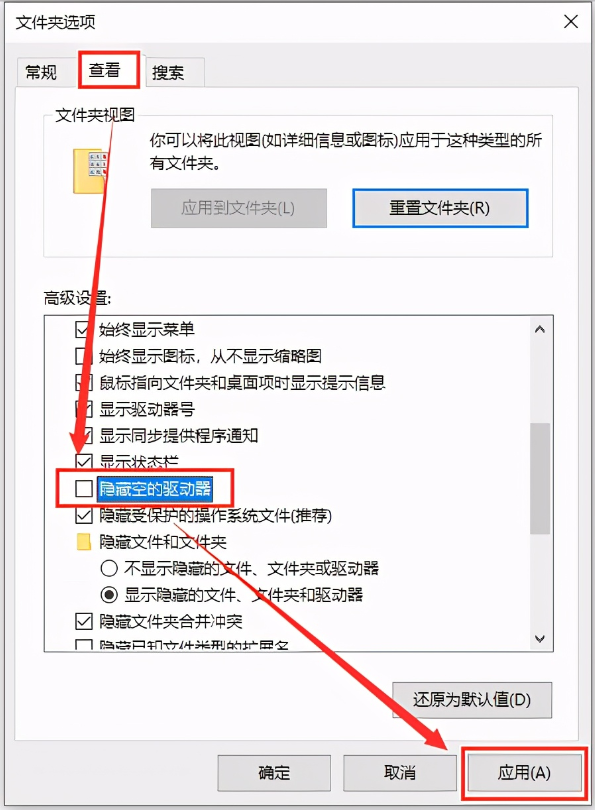 2、在文件夹选项界面,点击「查看」,取消勾选「隐藏空的驱动器」,然后点击「应用」,这样就能显示出隐藏的u盘盘符。