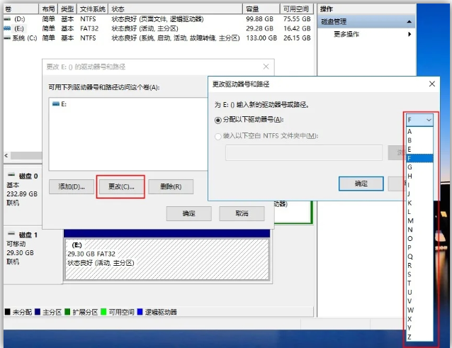 2、在弹出的窗口中点击「更改」,选择一个未被占用的盘符,点击确定,这样电脑就会重新识别U盘并安装相关驱动。