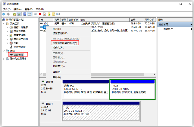 1、这个方法可以解决大部分U盘无法识别的问题。打开电脑的「计算机管理」界面,在右侧「存储」-「磁盘管理」,找到「可移动磁盘」,并击选择「更改驱动器号和路径」。