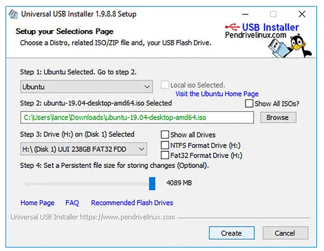 通用 USB 安装程序,顾名思义,允许您创建任何类型的可启动 USB 媒体。它易于操作,可以创建任何类型的可启动 USB 媒体,无论是 Linux 和 Windows、特殊的防病毒救援驱动器、渗透测试驱动器或其他低级可启动驱动器。界面非常简洁明了。只需从下拉菜单中选择操作系统,选择 ISO 文件,然后点击安装。此外,该软件将处理制作目录、引导分区等的所有过程。该软件的另一个有用功能是它允许创建具有持久性存储的 USB 可启动设备。您可以在创建可启动 USB 驱动器时选择持久性存储的存储量,但此功能仅适用于选定的 Linux 发行版。