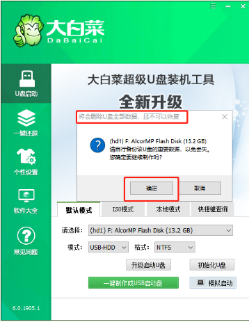 1、我们打开下载安装好的大白菜软件并插入U盘,选择“默认模式”,点击需要制作启动的设备,在模式选项中选择“USB-HDD”,格式选择“NTFS”即可。