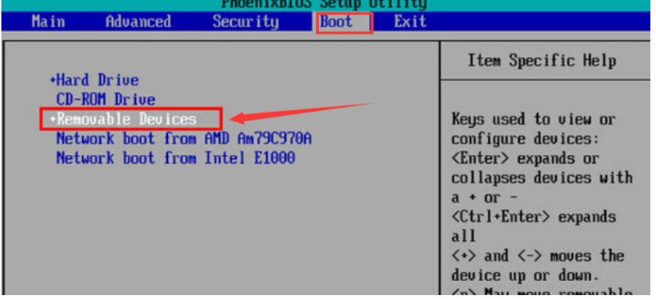 2.然后把光标移动到“boot”,找到u盘的选项,这里是“removeble device”。