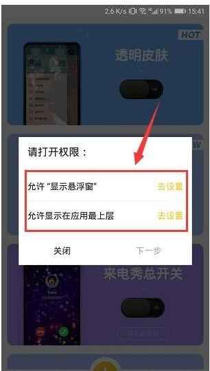 3、 点击打开透明皮肤,需要在手机里设置允许这个软件显示在应用最上层,点击 去设置,然后开启 在其他应用上层显示,如下图
