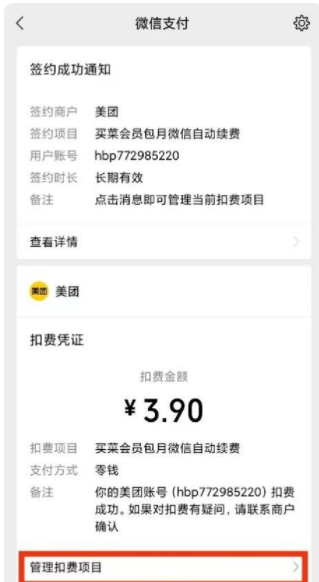 1、点击进入【微信支付】公众号,找到已经开通自动扣费项目的支付凭证,点击【管理扣费项目】进入。