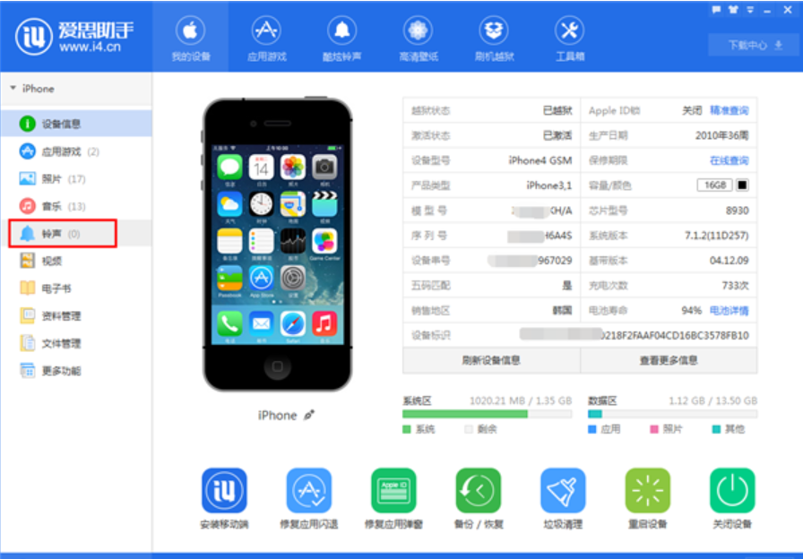 1、首先得在PC端下载安装爱思助手,步骤安装完成以后把手机连接电脑,打开爱思助手客户端,如下图所示,打开左边的“铃声”。