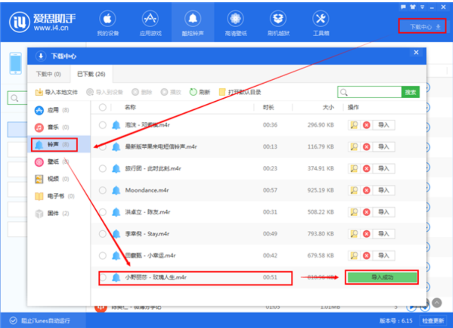 5、,在“下载中心”即可看到我们刚刚下载的铃声“玫瑰人生”;用爱思助手下载完铃声以后,系统会自动给您导入,您可以直接回到手机上去进行设置为铃声就可以了。