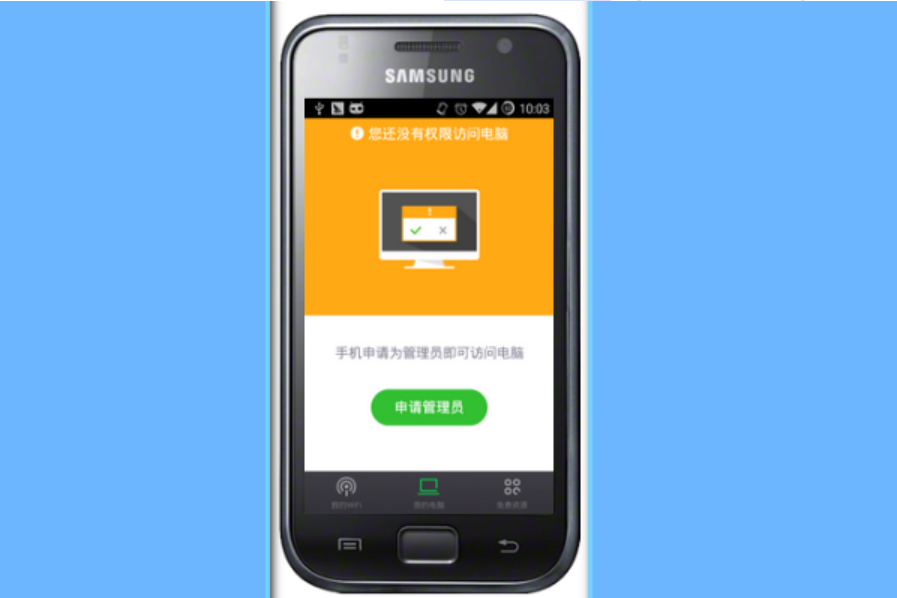 6、点击360wifi手机版下面三个选项中的”我的电脑“,再点击”申请管理员“。