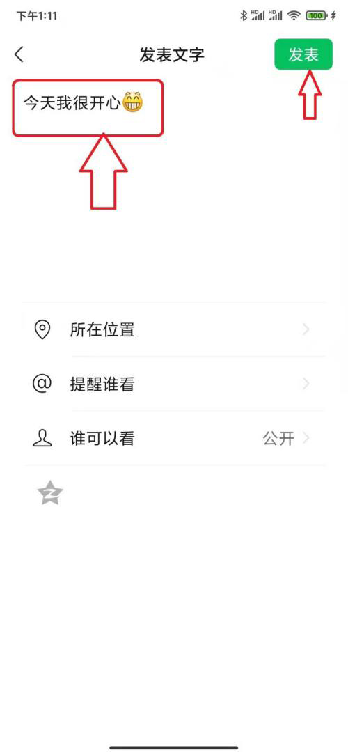 4、这个时候就会朋友圈的编辑页面,然后在发表文字下方的设置框中输入想要发表的文字内容,然后点击右上角的"发表"选项,发表文字朋友圈就设置完成了。