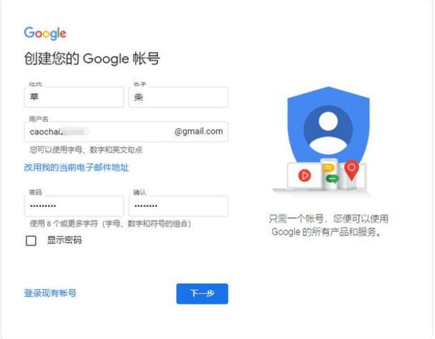 2、创建您的google帐号或者谷歌gmail邮箱帐号,我们按要求填写姓名、用户名、密码等信息,单击下一步继续。