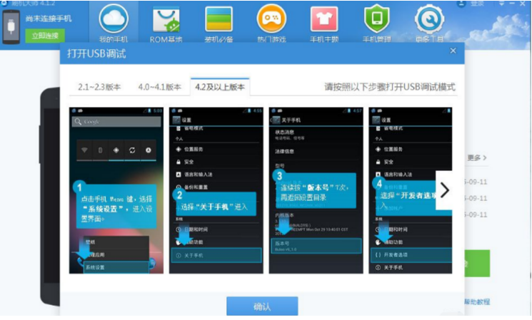 2、接着用数据线连接到电脑,在手机设置中我们找到USB调试开启连接到刷机大师工具。