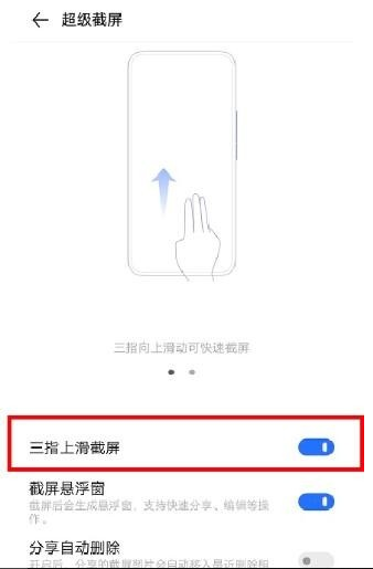 2、在超级截屏的选项界面中,点击打开“三指上滑截屏”,打开之后按钮就会显示蓝色啦。