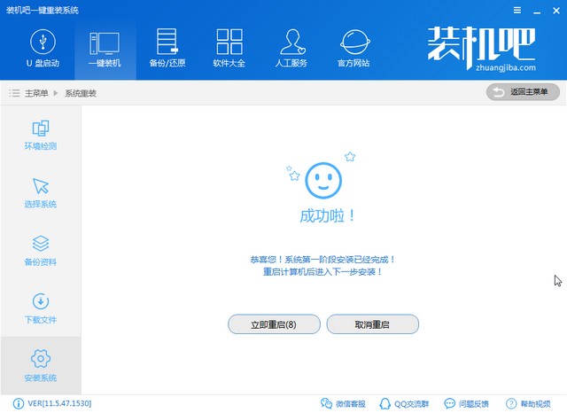 1、下载装机吧一键重装系统软件,根据提示操作,点击我知道了按钮进入功能界面,直接点击系统重装。