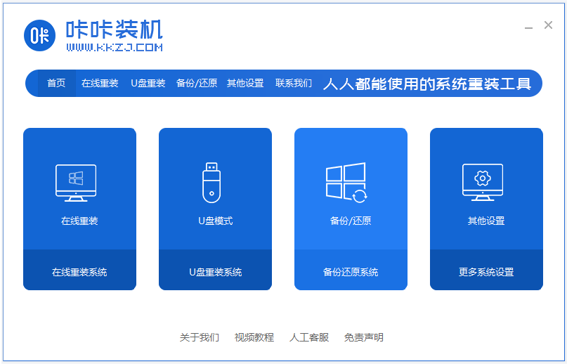 1、我们先自行网上搜索并下载原版win7系统镜像解压到非系统盘,接着再下载安装好咔咔装机一键重装系统软件并打开,单击[备份还原],安装之前注意备份好系统盘上面重要的数据。(如果找不到win7镜像下载地址的话,可以在“装机吧官网”中查找看下)