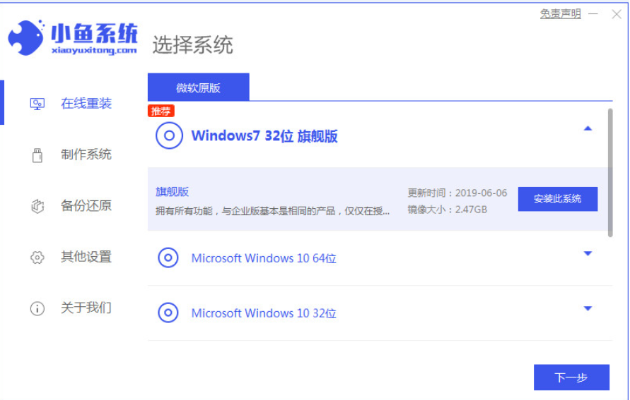 1、下载好小鱼一键重装软件;打开小鱼系统软件,点击安装win7系统,选择后单击下一步。