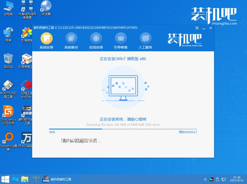 5、在pe系统桌面上打开装机吧装机工具,选择win7系统点击安装到c盘。