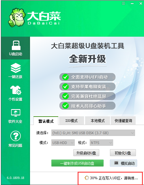 5、 大白菜装机版U盘工具此时将会对U盘写入大白菜相关数据,请大家耐心等待。