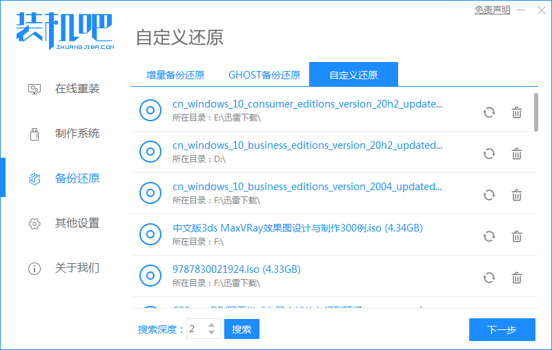 1、首先您需要下载装机吧一键重装系统工具,然后再下载个 Windows 10 系统原版镜像,一般原版镜像中包含了多个版本。打开软件选择备份还原功能,然后选择自定义还原它会自动搜索电脑中的 Windows 10 原版系统镜像。