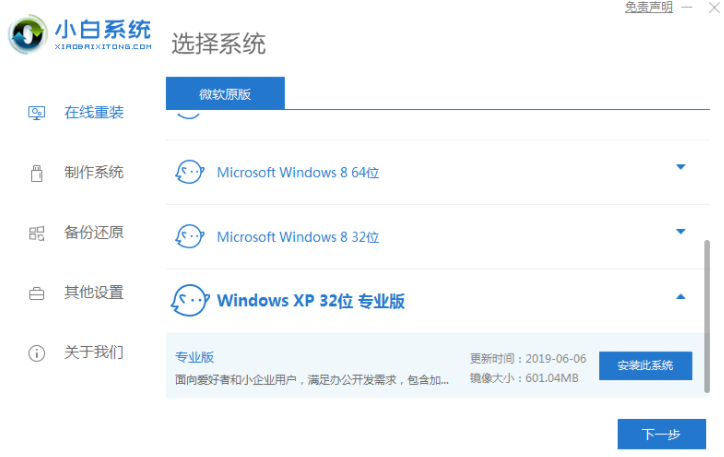 1.下载并打开电脑上的小白一键重装系统工具,选择需要安装的xp系统,点击安装系统。(安装前注意备份c盘的重要信息,关闭电脑上的杀毒软件,避免被拦截)