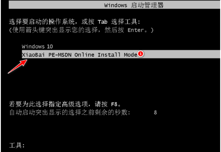 4、重启后进入了开机界面,选择xiaobai-pe系统进入。