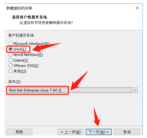 4.操作系统选择Linux(L),版本选择Red Hat Enterprise Linux 7 64 位操作系统,点击下一步。