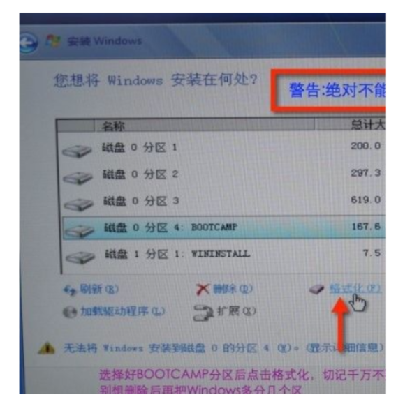 8、选择驱动器选项(高级),将选好的Boot Camp分区格式化。注意:不可点击删除。