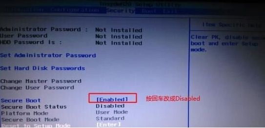 1、首先打开电脑,进入到bios当中,点击【Security】,选择下面的【Secure Boot】将其修改为【Disabled】。