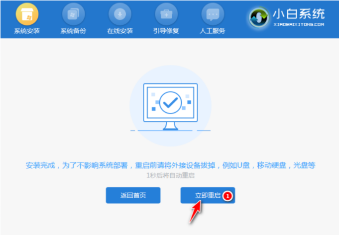 7、等待系统安装完成之后,拔掉u盘点击立即重启电脑。