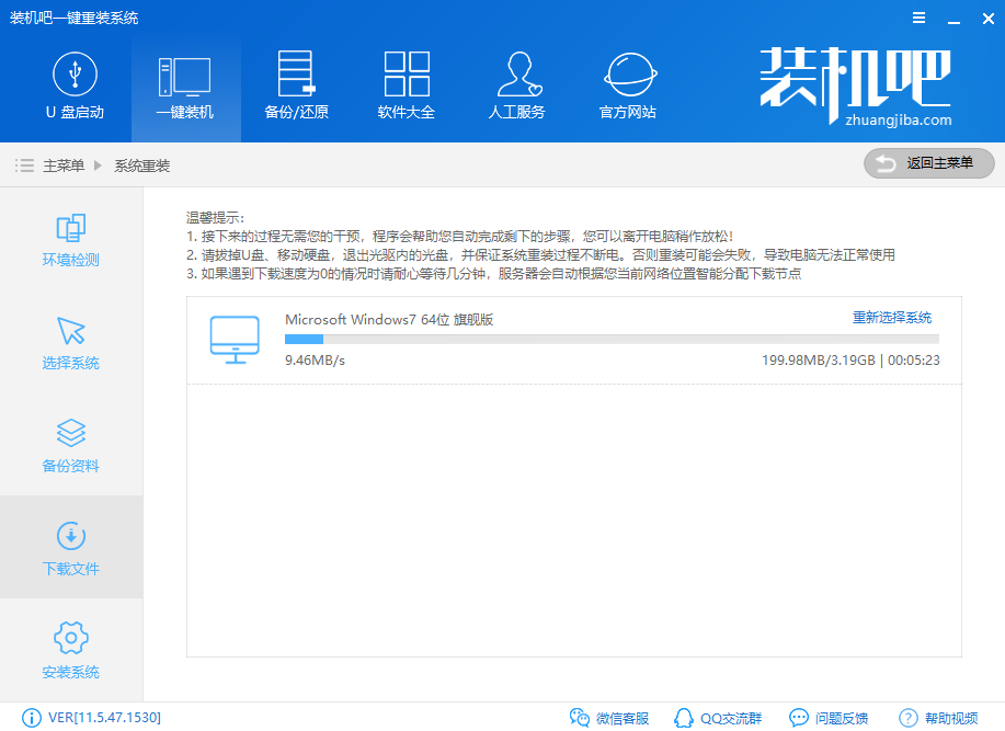 2、 打开运行装机吧一键重装系统软件,打开前先关闭所有的杀毒软件,避免因拦截造成重装过程失败。